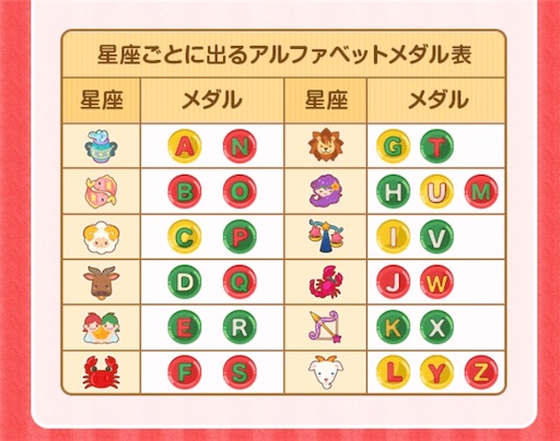 水やりタッチをした後に貰える、星座メダルとはまた別のアルファベットメダルを交換して、アルファベットのオーナメントアイテムと交換することができます。